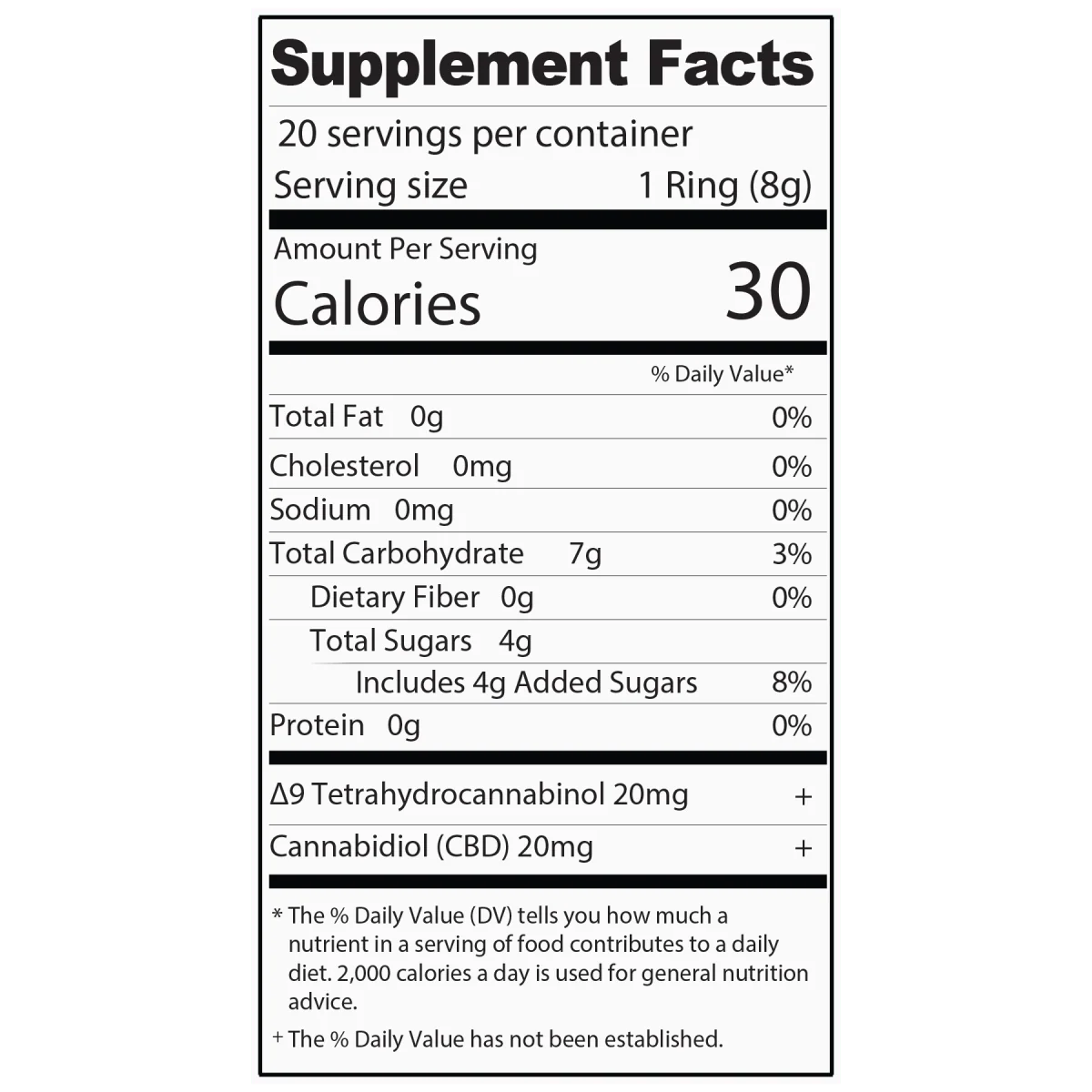 Live Resin Gummies Per Jar: 20 pcsTotal THC Content: 400mgTotal CBD Content: 400mgD9 Content Per Gummy: 20mgCBD Content Per Gummy: 20mg