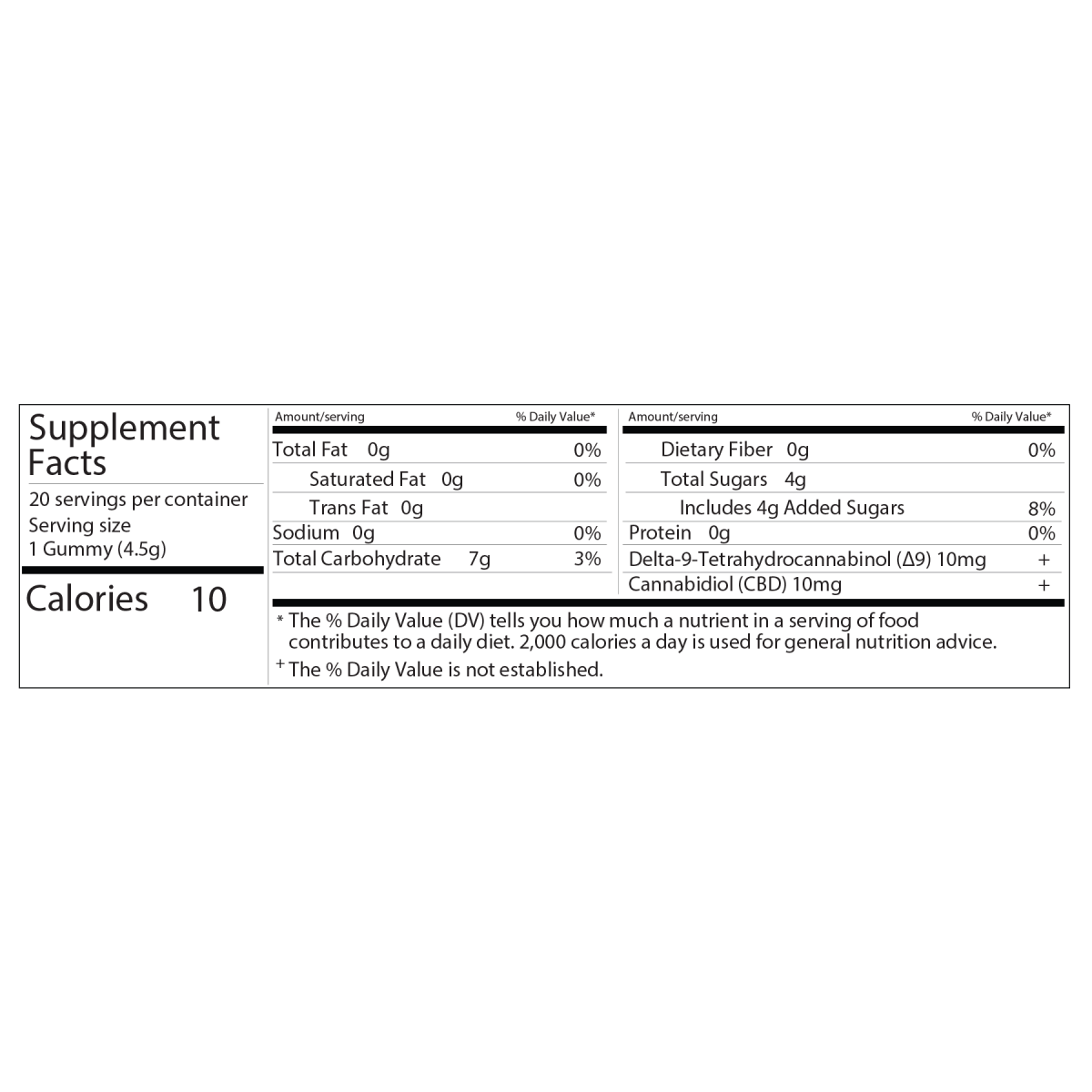 - 10mg of Delta 9 THC and 10mg of CBD per gummy