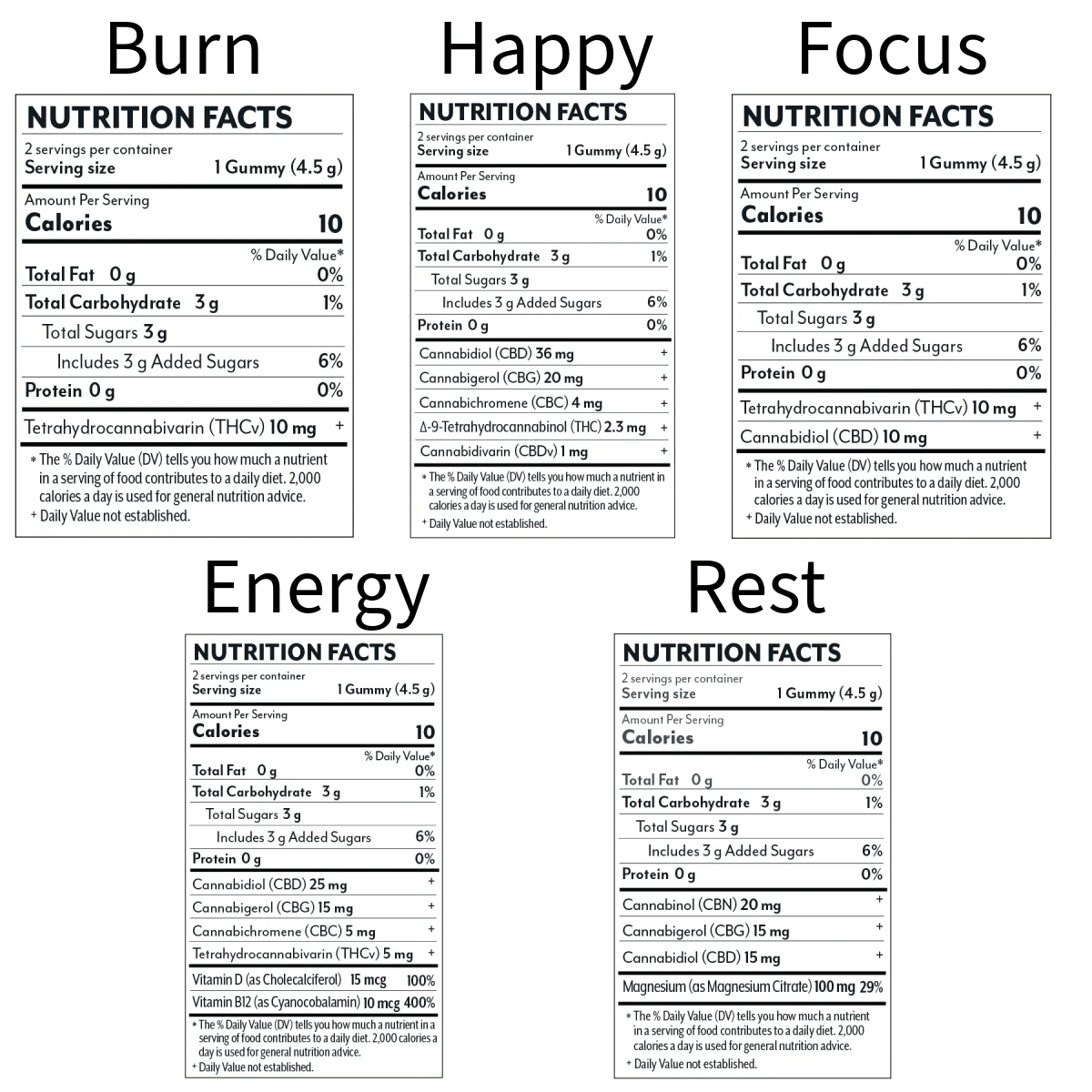 Experience the Energy Blend, the best CBD gummies for energy and momentum to kickstart your day. Or indulge in the Rest Blend, designed to melt away stress and promote restful sleep after a long day. Uplift your mood with our Happy Blend, for a well-rounded experience with calming effects to improve your mood. For those seeking a natural energy boost, the Focus Blend provides heightened focus and mental clarity, while the Burn Blend, formulated with rapid-release THCv, offers increased focus, lifted mood, and weight loss support.Â